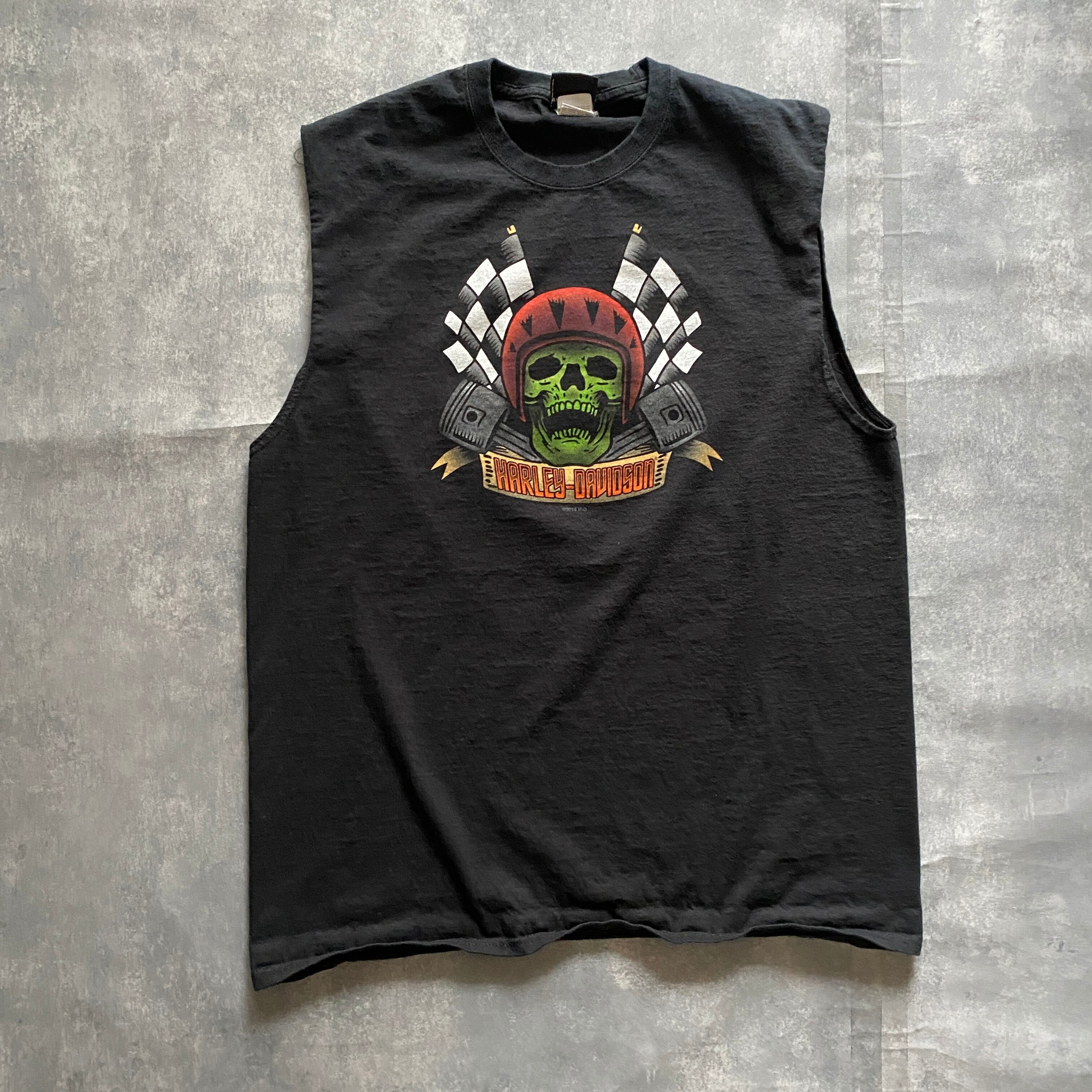 【XLサイズ】00’s ハーレーダビッドソン スカル×フラッグ プリントロゴ タンクトップ Tシャツ