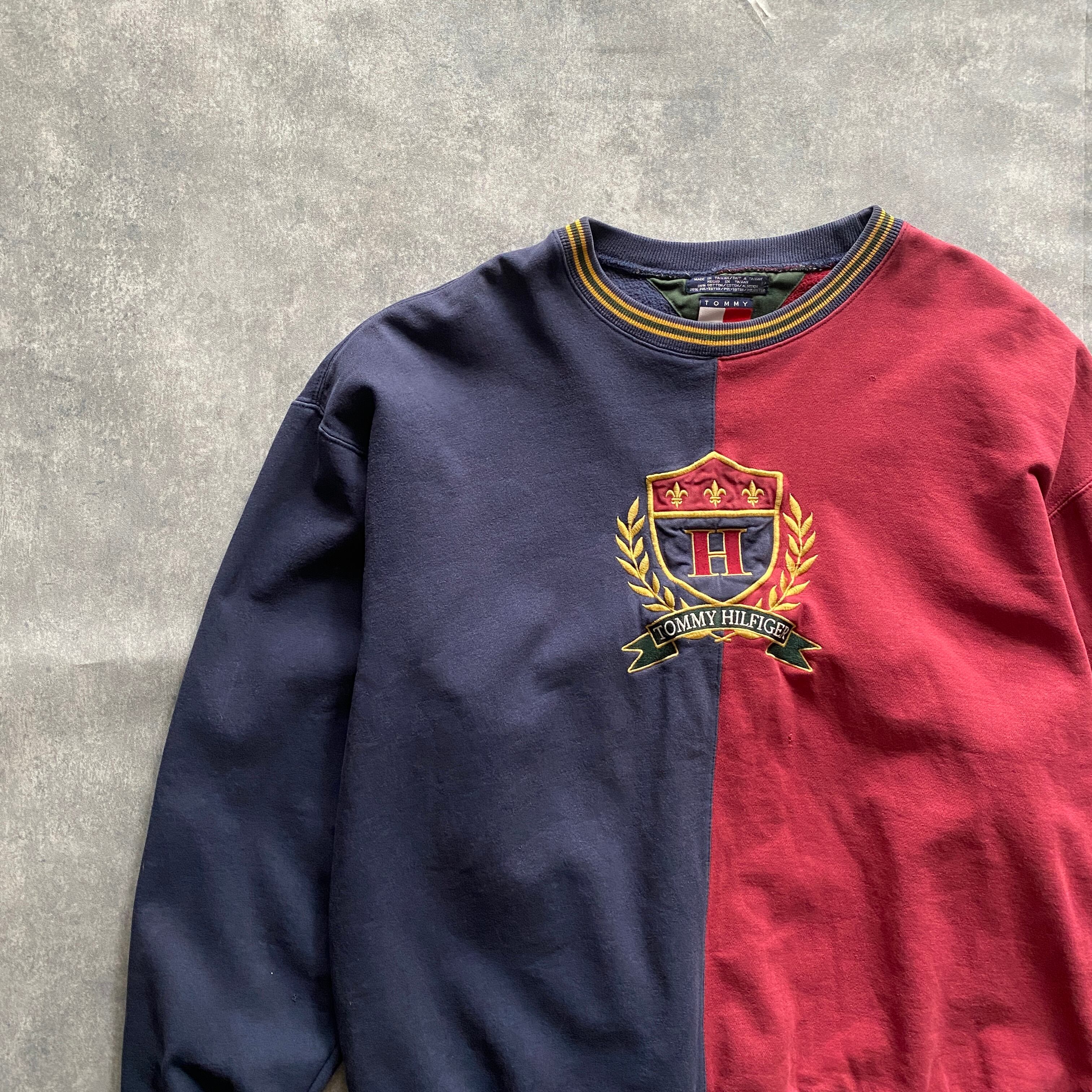 【XLサイズ】90’s トミーヒルフィガー 刺繍エンブレムロゴ ラインリブ バイカラー スウェット